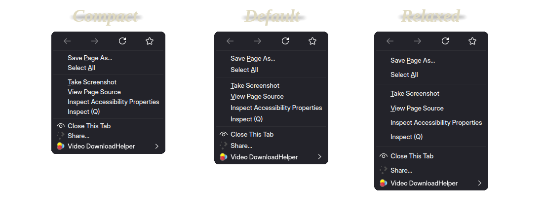 ultima.spacing.compact.contextmenu and ultima.spacing.relaxed.contextmenu can make the context menu spacing bigger or smaller. Mac OS Users should use the gtk context menu, because it matches FF Ultimas theme.